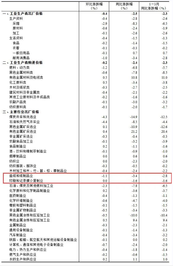 二、工業(yè)生產(chǎn)者價(jià)格環(huán)比變動(dòng)情況 3月份,工業(yè)生產(chǎn)者出廠價(jià)格中,生產(chǎn)資料價(jià)格下降0.4%,影響工業(yè)生產(chǎn)者出廠價(jià)格總水平下降約0.30個(gè)百分點(diǎn)。生活資料價(jià)格下降0.4%,影響工業(yè)生產(chǎn)者出廠價(jià)格總水平下降約0.11個(gè)百分點(diǎn)。 工業(yè)生產(chǎn)者購(gòu)進(jìn)價(jià)格中,燃料動(dòng)力類價(jià)格下降1.2%,黑色金屬材料類價(jià)格下降0.6%,建筑材料及非金屬類價(jià)格下降0.4%,農(nóng)副產(chǎn)品類、紡織原料類價(jià)格均下降0.1%;有色金屬材料及電線類、化工原料類價(jià)格均上漲0.5%。 值得關(guān)注的是,2025年3月份印刷和記錄媒介復(fù)制業(yè)工業(yè)生產(chǎn)者出廠價(jià)格同比下降1.6%,2025年1—3月份印刷和記錄媒介復(fù)制業(yè)工業(yè)生產(chǎn)者出廠價(jià)格同比下降1.6%。 2025年3月份造紙和紙制品業(yè)工業(yè)生產(chǎn)者出廠價(jià)格同比下降3.4%,2025年1—3月份造紙和紙制品業(yè)工業(yè)生產(chǎn)者出廠價(jià)格同比下降2.8%。 2025年3月份工業(yè)生產(chǎn)者價(jià)格主要數(shù)據(jù)