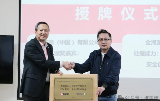 圖:維美德中國區總裁朱向東(左)與金海漿紙總經理孟祥巖(右) RB1運行情況分享:預防性維護,保障穩定運行 金海漿紙堿回收部經理張剛平詳細分享了堿爐RB1二十年來的運行情況。他表示,堿爐RB1自投產以來,始終保持穩定運行,各項指標均優于設計值,為漿紙生產提供了堅實保障。金海漿紙工務部機械處處長張奎表示,這一成就得益于金海漿紙“預防性維護”的管理理念,以及維美德提供的專業服務支持。金海漿紙團隊通過嚴格的預防性維護計劃,定期檢查設備關鍵部件,并結合維美德“供貨加人加技術服務”的模式,及時排除了潛在隱患。 孟祥巖特別提到,維美德徐玲、董成忠帶領的技術服務團隊在堿爐年度檢修期間深入現場提供專業檢查服務,及時發現并科學分析問題,制定專業方案,讓他們感受到維美德的專業性和服務價值。這種強調科學和數據支持的“硬實力”和全生命周期服務的模式,確保了設備的長期穩定運行。 發展規劃與反饋:同心致遠,邁向新高度 孟祥巖向維美德團隊介紹了公司未來的發展規劃。他表示,作為全球領先的林漿紙一體化綠色循環企業,金海漿紙始終秉承“節能減碳,綠色發展”的可持續發展理念,將繼續推進林漿紙一體化發展戰略,在節能減碳和數字化智能化領域持續投入與創新,推動行業綠色轉型。 同時,他對維美德團隊的支持表示感謝:“維美德的技術和服務始終是我們信賴的保障。未來,我們期待與維美德繼續攜手,共同應對行業挑戰,邁向新的高度。” 維美德中國區漿線和能源工廠優化總監嚴桂榮表示:“我們將繼續以客戶為中心,以深度交流和定制化的合作模式,提供量身定制的解決方案,幫助金海漿紙解決當前問題,預防潛在故障,為金海漿紙創造更大的價值和保障。” 授牌儀式與合影:紀念輝煌時刻 在雙方的熱烈掌聲中,授牌儀式正式舉行。朱向東代表維美德向金海漿紙孟祥巖頒發了題有 “熱烈祝賀金海漿紙堿爐RB1穩定運行二十年”的牌匾。牌匾上還特別注明: 理念超前,預防維護除隱患; 同心致遠,專業服務助輝煌。 授牌儀式后,雙方團隊在金海漿紙合影留念,共同記錄下這一值得紀念的時刻。此外,維美德團隊在金海漿紙總經理辦公室經理祝金俠的講解下參觀了企業展廳,并對金海漿紙在制漿造紙領域的卓越表現表示由衷的欽佩。