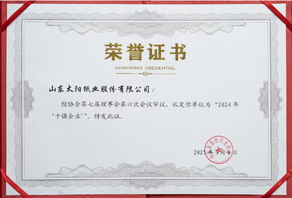 2025年5月8日-9日,以“創(chuàng)新驅(qū)動(dòng)、綠色發(fā)展”為主題的“2025山東省造紙行業(yè)年會(huì)暨山東省造紙產(chǎn)業(yè)綠色低碳高質(zhì)量發(fā)展大會(huì)”在山東德州成功召開。會(huì)上,中國(guó)造紙協(xié)會(huì)副理事長(zhǎng)、山東省造紙行業(yè)協(xié)會(huì)專職副會(huì)長(zhǎng)趙振東宣讀了《山東協(xié)會(huì)認(rèn)定“雙十”標(biāo)桿企業(yè)——山東省造紙行業(yè)協(xié)會(huì)“2024年‘十強(qiáng)企業(yè)’‘十佳企業(yè)’”通報(bào)》,其中,山東太陽(yáng)紙業(yè)股份有限公司被認(rèn)定為“2024年‘十強(qiáng)企業(yè)’”。
