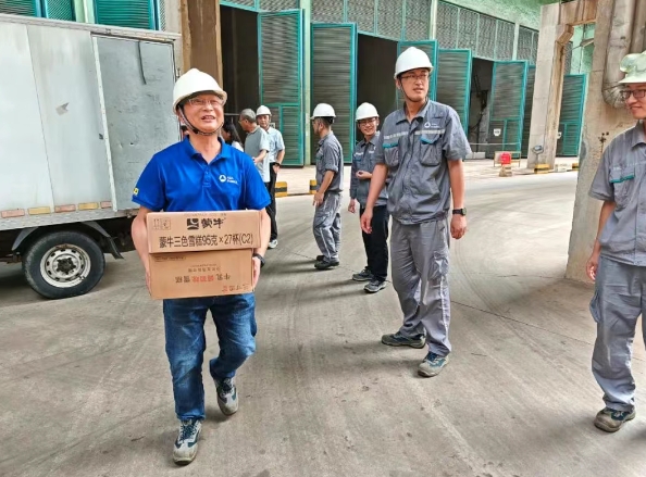 為切實保障廣大一線員工特別是高溫艱苦崗位員工的身體健康與作業安全,有效預防高溫中暑,傳遞公司人文關懷,公司工會2025年度“炎夏送清涼,關愛沁人心”主題活動于8月5日正式拉開帷幕。此次活動用實實在在的行動,為奮戰在酷暑中的員工們撐起一片“綠蔭”。 活動期間,公司董事副總經理、工會主席王偉國,金鷹集團山東公共事務總經理、公司黨委書記李潤明帶隊,聯合工會及生產部門負責人,組成 “送清涼”慰問團,深入一線崗位,親手將雪糕、飲料等防暑降溫物資送到大家手中。面對面傾聽大家的需求和心聲,傳遞公司的感謝與敬意。