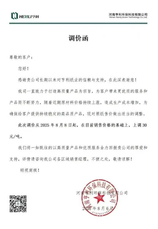 2、自8月13日起,天津基地、河北基地再生牛卡系列、瓦楞紙價格上調 50 元/噸。
