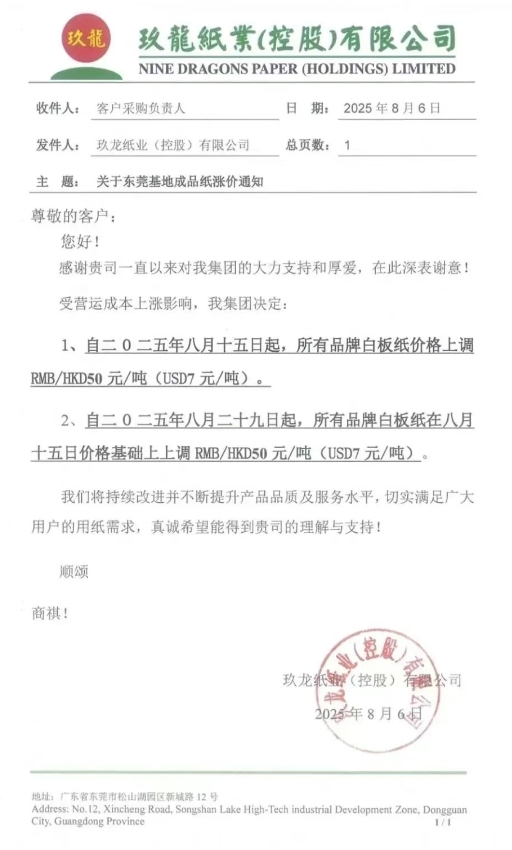 2、自8月29日起,所有品牌白板紙在8月15日價格基礎上上調RMB/HKD 50 元/噸(USD 7 元/噸)。