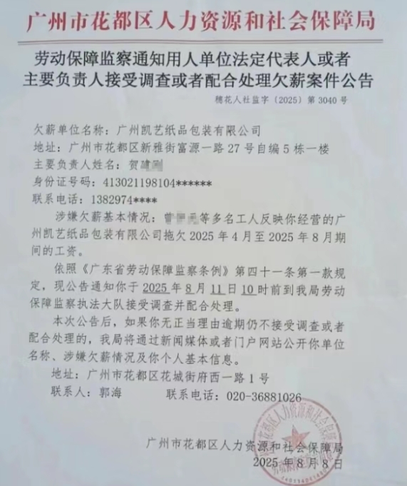 近日,廣東包裝印刷行業又傳出一則“暴雷”消息:廣州凱藝紙品包裝有限公司(以下簡稱:廣州凱藝紙品)因資金鏈斷裂宣布倒閉,眾多員工及供應商現場維權。 公開資料顯示,廣州凱藝紙品注冊成立于2017年,專注于彩盒后道加工領域。公司擁有十余臺全自動制盒機,生產旺季時員工數量多達300余人,憑借穩定的產能與工藝技術,年產值高達上億元,在當地包裝印刷供應鏈中扮演著重要角色。 然而,面對成本不斷攀升、業務持續下滑等多重壓力,廣州凱藝紙品的資金問題逐漸浮出水面。在廣州市花都區人力資源和社會保障局于8月8日發布的一份公告顯示,該公司因拖欠2025年4月至2025年8月期間的工資,被要求接受調查并配合處理。