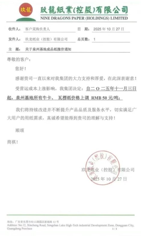 隨著玖龍、山鷹等龍頭紙企率先上調原紙價格,新一輪漲價潮已拉開序幕。各地紙企緊隨其后,陸續發布調價函,漲價壓力正逐步向下游傳導。 • 玖龍泉州基地 自十一月三日起,泉州基地所有?ā⑼呃慵垉r格上調 RMB 50 元/噸。