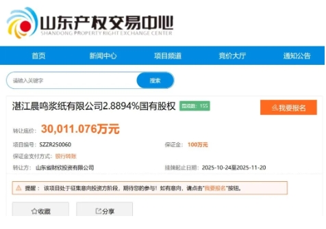 山東產(chǎn)權交易中心信息顯示,山東省財欣投資有限公司(以下簡稱“財欣投資”)自10月24日起掛牌轉讓其持有的湛江晨鳴漿紙有限公司2.8894%股權,轉讓底價3億元。