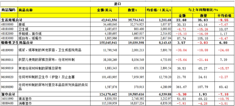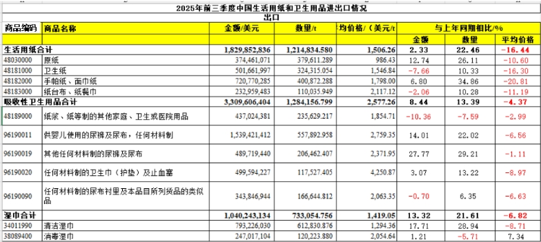 進口 2025年前三季度,生活用紙總進口量比2024年同期增長,但進口量很少,僅有約3.57萬t。進口的生活用紙以原紙為主,占總進口量的91.2%。 吸收性衛生用品 2025年前三季度,中國吸收性衛生用品出口量持續增長,進口量則不斷下滑,這主要是由于國內吸收性衛生用品產能增長、品質提升,對進口產品的需求下降。 出口 2025年前三季度,吸收性衛生用品的總出口量達128.42萬t,同比增長13.39%,嬰兒紙尿褲在吸收性衛生用品出口量中占比最大,占總出口量的43.44%。吸收性衛生用品的出口金額達33.10億美元,同比增長8.44%。 女性衛生用品、嬰兒紙尿褲、成人失禁用品的出口量均有不同程度的增長,但寵物墊、護理墊等衛生用品出口對應的商品編碼48189000(紙漿、紙等制的其他家庭、衛生或醫院用品)下的產品出口量同比下降7.59%。分析原因是美國加征關稅對我國二、三季度出口帶來一定的影響,該編碼下產品出口目的地排名第一的美國的出口量由2024年前三季度的93.095.289t,下降到2025年前三季度的73.015.091t。