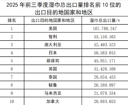 進口 2025年前三季度,吸收性衛生用品進口量僅有1.90萬t,同比減少3.3%,進口量連續多年降低。其中,嬰兒紙尿褲的進口量同比下降21.44%,至8.056.549t,在各類吸收性衛生用品中降幅最大。 濕巾 2025年前三季度,中國濕巾出口量大幅增長,出口產品以清潔濕巾為主,進口量與上年同期基本持平,但總量較少,濕巾出口量遠高于進口量。 出口 2025年前三季度,濕巾的出口總量為73.31萬t,同比大增21.61%。出口產品以清潔濕巾為主,出口量占比約為83.60%。