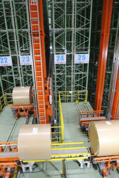 走進(jìn)倉庫內(nèi)部,智能化設(shè)備林立。平板紙庫中,一個(gè)個(gè)平板紙托盤通過輸送線精準(zhǔn)運(yùn)輸,堆垛機(jī)在巷道中靈活穿梭,高效完成存儲和調(diào)取任務(wù)。卷筒紙庫內(nèi),巨大的卷筒紙?jiān)趯僭O(shè)備的操作下,有序地進(jìn)入貨格。倉庫的自動化輸送系統(tǒng)如同一條智能脈絡(luò),將文化紙和紙板與倉庫緊密連接,成品在各個(gè)環(huán)節(jié)高效流轉(zhuǎn)。