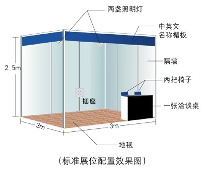 豪華標(biāo)準(zhǔn)展位(豪標(biāo)) 展位費用:人民幣11500 / 9㎡ 中英文楣牌、4米(高)豪標(biāo)展位、圍板高度2.5米、展示臺、4把折椅、4盞射燈、1張咨詢桌、1張玻璃圓桌、5A/220V電源插座(1個,500W)、1個廢紙簍、展位內(nèi)地毯。 * 雙面 / 三面轉(zhuǎn)角位開口,需加收10%費用。 * 配置升級,提升品牌形象,優(yōu)選方案。