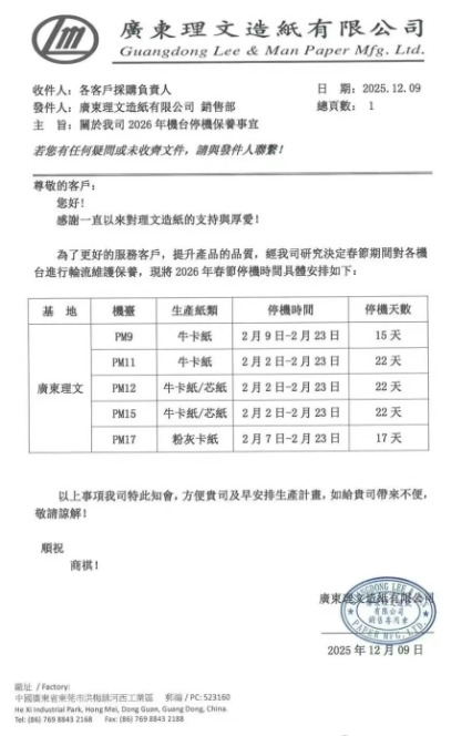 本周,玖龍、理文和山鷹陸續宣布2026年1-2月檢修計劃。根據目前已經發布的停機通知,預計減產約27萬噸包裝紙,其中絕大多數為箱板瓦楞紙。