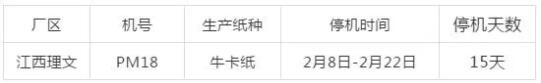 2021年1月6日,江西理文造紙有限公司發布通知稱,因生產機器設備需進行停機檢修,生產牛卡紙的PM18紙機計劃在2021年2月8日-2月22日期間停機15天。