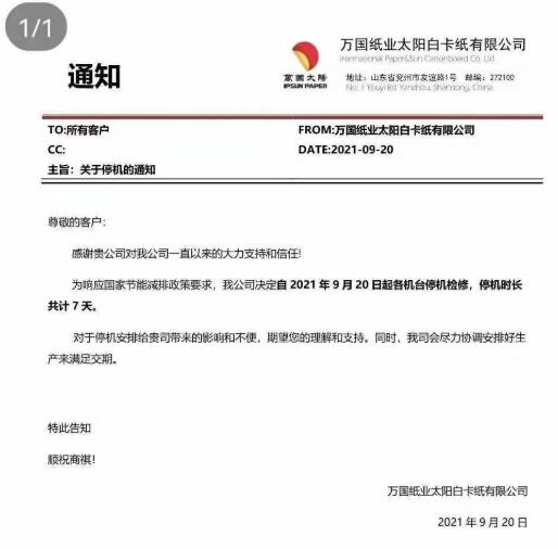 9月20日,萬國紙業太陽白卡紙宣布各機臺停機檢修,停機時長共計7天。