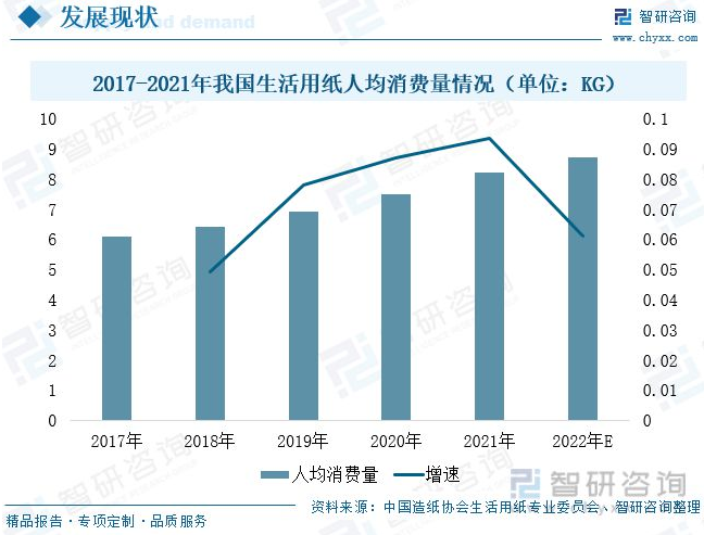 生活用紙是消費量巨大的日用消費品,隨著我國經濟發展水平和人民生活水平日益提高,全國各地區對生活用紙的消費量都呈穩定增長態勢。數據顯示:2021年我國生活用紙消費量達到1162萬噸,同比增長10.77%,國內生活用紙市場規模約1406.6億元,是全球最大的生活用紙消費國。隨著居民生活水平不斷提升以及消費者健康衛生意識不斷增強,2022年生活用紙消費量將延續增長態勢,達到1236萬噸,這將進一步拉動造紙設備需求上漲。同時,隨著人們對生活用紙質量要求越來越高,使得造紙行業對造紙設備技術要求逐步提升,也將進一步推動造紙設備升級轉型,行業發展潛力較大。