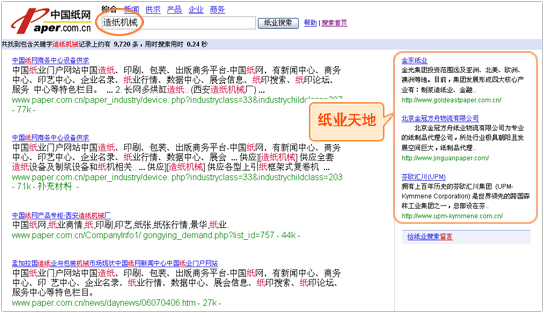 • 中國(guó)紙網(wǎng)紙業(yè)天地出現(xiàn)在網(wǎng)頁(yè)搜索結(jié)果頁(yè)面的右側(cè)區(qū)域和頂部Banner區(qū)域,點(diǎn)擊后可直接進(jìn)入企業(yè)所指定的網(wǎng)站或鏈接地址; ![]() • 顯示結(jié)果與搜索關(guān)鍵詞綁定,搜索某個(gè)關(guān)鍵詞,即會(huì)出現(xiàn)與之相對(duì)應(yīng)的文字鏈,如果搜索關(guān)鍵詞不是企業(yè)所購(gòu)買(mǎi)的關(guān)鍵詞,在搜索結(jié)果中也沒(méi)有相對(duì)應(yīng)的中國(guó)紙網(wǎng)紙業(yè)天地文字鏈; • 每個(gè)關(guān)鍵詞的中國(guó)紙網(wǎng)紙業(yè)天地位置均為6個(gè); • 中國(guó)紙網(wǎng)紙業(yè)天地的內(nèi)容包括網(wǎng)頁(yè)標(biāo)題、網(wǎng)頁(yè)描述以及客戶(hù)指向的URL地址。要求網(wǎng)頁(yè)標(biāo)題不超過(guò)20個(gè)字,網(wǎng)頁(yè)描述不超過(guò)50個(gè)字,內(nèi)容由企業(yè)提供,中國(guó)紙網(wǎng)負(fù)責(zé)審核以及上線(xiàn); • 如果文字中包含所綁定的關(guān)鍵詞,則顯示時(shí)關(guān)鍵詞會(huì)用紅色突出。 |